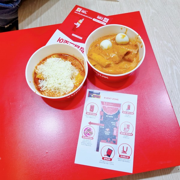 내부로 들어가면 엽기떡볶이의 마스코트인 엽이와 덕이가 반겨준다. 엽기떡볶이 어플을 다운로드 후 회원가입을 하면 스태프가 시식이 가능한 카드를 주는데 메뉴는 콘치즈와 마라, 로제마라 세종류가 있다. 이 메뉴들은 판매하지 않고 있는 팝업스토어 한정 메뉴이다.