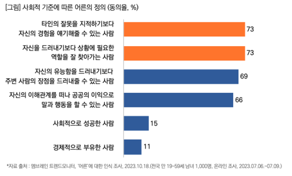 그렇다면 사회적으로는 어떤 기준을 갖춰야 어른이라고 인식하고 받아들일까? 어른이란 타인의 잘못을 지적하기보다 자신의 경험을 얘기해줄 수 있고(73%), 자신을 드러내기보다 상황에 필요한 역할을 잘 찾아가고(73%), 주변 사람의 장점을 드러내줄 수 있는 사람(69%)이 진정 어른이라는 인식이 비교적 높았다. 즉 경제적인 조건보다는 성품 면에서 배려심과 이타심을 갖춘 사람이 진짜 어른이라는 것이다.