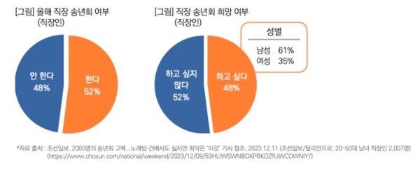 코로나19로 중단되었던 직장 송년회가 올해 4년여 만에 재개되고 있다. 최근 직장인들의 송년회 인식을 알 수 있는 조사 결과(조선일보/틸리언프로)가 있어 살펴본다.