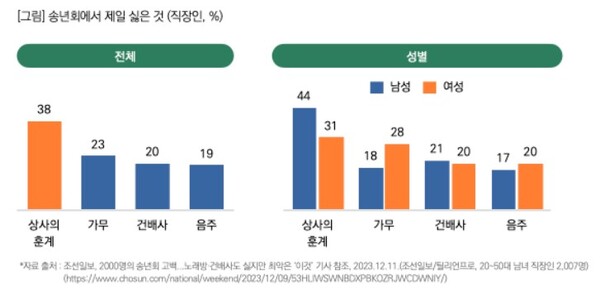 송년회에서 가장 싫은 것을 질문한 결과, ‘(상사의) 훈계’가 38%로 1위였고, ‘여성(31%)’보다 ‘남성(44%)’이 ‘훈계’를 꼽은 비율이 크게 높았다. 그 외에 ‘가무’ 23%, ‘건배사’ 20%, ‘음주’ 19% 등의 순으로 조사됐다.