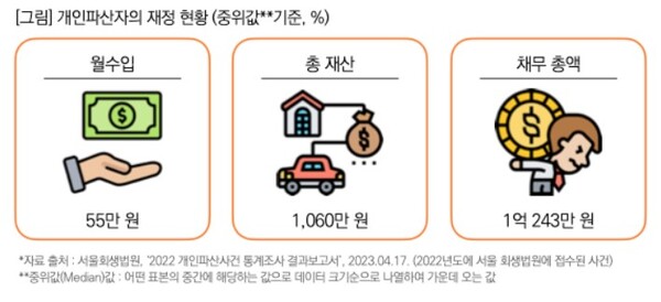 개인파산자의 재정 현황을 살펴보았다. 중위값 기준으로 월 수입은 55만 원, 재산은 1,060만 원이었고, 채무 총액은 1억 243만 원으로 총 재산의 10배가량되는 것으로 나타났다.