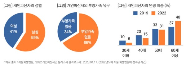 개인파산자를 성·연령별로 살펴보면 먼저 남성(59%)이 여성(41%)보다 많았고, 부양가족이 없는 경우, 60세 이상에서 높은 특징을 보였다. 특히 60대 이상 노인 파산자는 2019년 37%에서 2022년 48%로 전체 파산자의 절반가량까지 비중이 높아져 주목된다.