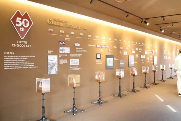 1층에서 맛있는 디저트와 굿즈들을 즐겼다면 2층에서는 출시 50년의 역사를 만나볼 수 있었는데 1975년 가나 초콜릿 출시 당시에는 포장지에 ‘가나 쵸코렏’이라고 써있었다. 가나 마일드 쵸코렡과 가나 밀크 쵸코렏은 이때부터 50년간 사랑받는 메가브랜드가 되기까지의 여정을 시작했다.