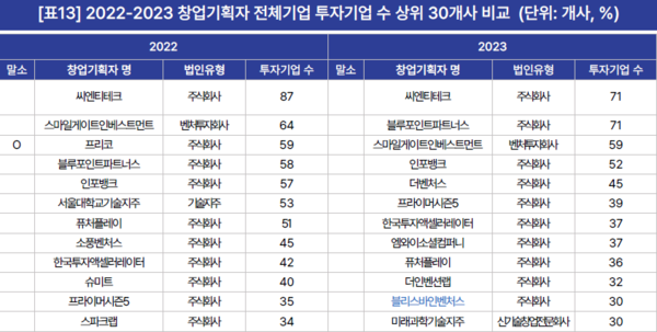 한편 국내 대표적인 액셀러레이터의 투자 활동을 볼 수 있는 투자 랭킹 부문을 살펴보면 2022-2023년 투자금액 상위 업체로 씨엔티테크, 스마일게이트인베스트먼트 블루포인트파트너스, 퓨처플레이를 비롯해 30개사가 있으며 이들 30개사의 투자금 합계는 2023년 4,247억 원으로 2023년 전체 AC 투자 6,671억 원의 63.7% 정도를 차지하고 있다.