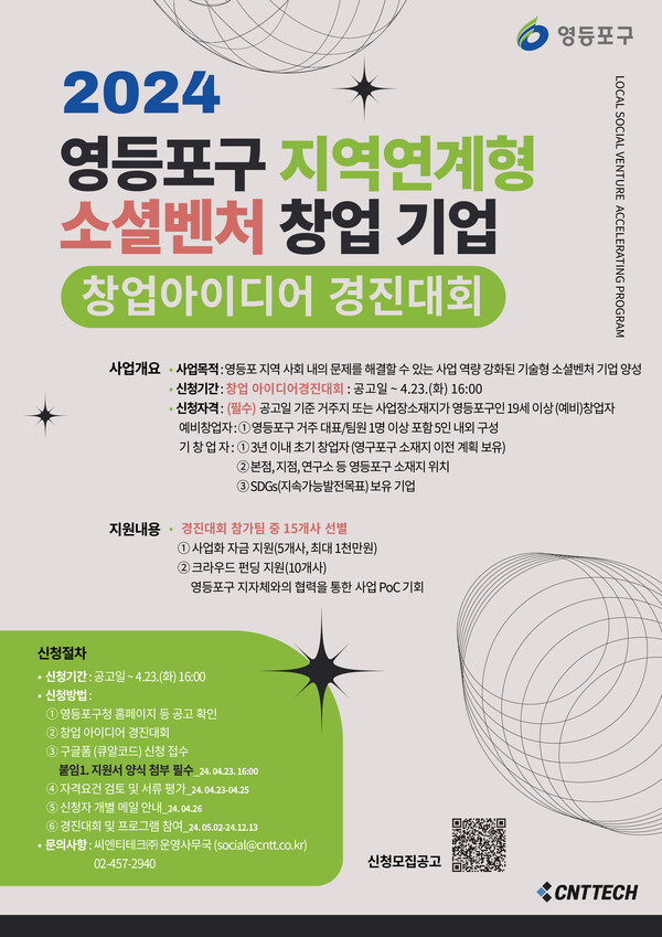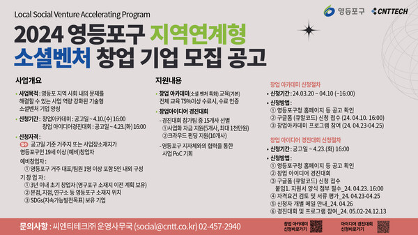 영등포구청과 씨엔티테크(주)가 함께 영등포구의 지역사회 문제를 해결하고자 ‘2024 영등포구 지역연계형 소셜벤처 창업기업’ 발굴에 나선다