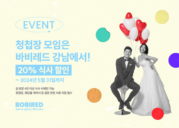 바비레드 관계자는 “바비레드에서 청첩장 모임을 진행하는 예비 신랑 신부 여러분들이 더욱 멋진 식사를 추억하고, 좋은 시간을 만들기 위해 프로모션을 기획했다.”며”바비레드 강남점에서 식사 퀄리티는 높게, 예산 부담은 낮게 합리적인 식사 자리를 즐기셨으면 좋겠다”고 전했다.