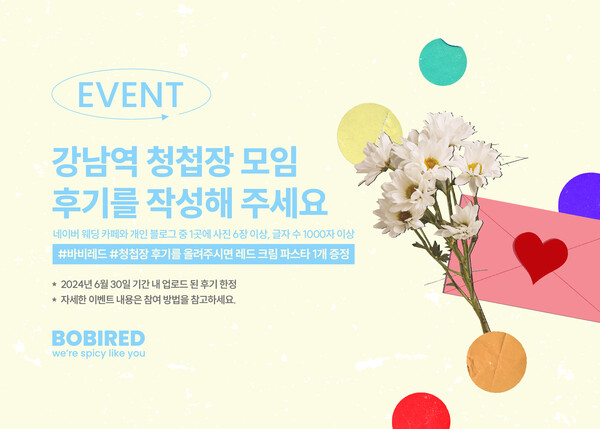 이어서 ‘바비레드 강남점’에서 청첩장 모임을 하고 리뷰를 작성하면 ‘바비레드’의 대표 메뉴인 ‘레드 크림 파스타’도 증정한다. 네이버 웨딩카페 혹은 개인 블로그 중 1곳에 사진 6장 이상, 글자수 1000자 이상의 분량으로 #바비레드 #청첩장모임 필수 태그를 작성해 후기를 올리면 오랜 시간 사랑받아온 소갈비 듬뿍 매콤한 ‘레드 크림 파스타’를 무료로 먹을 수 있는 것이다.