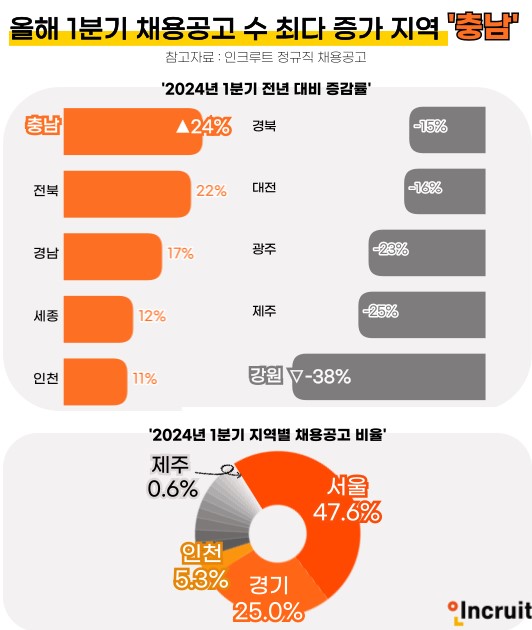 올해 1분기 정규직 채용공고 수가 가장 많이 증가한 지역은 ‘충남’이었다.