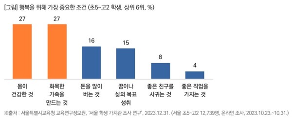 최근 서울시 교육청에서 서울의 초중고생을 대상으로 실시한 2023년 서울 학생 가치관 조사를 발표하였는데 해당 자료에서 ‘청소년들의 행복조건’과 ‘삶에 영향을 끼친 대상’에 관한 조사 결과를 살펴본다.