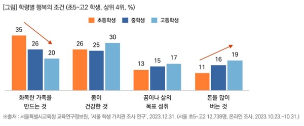 행복 조건, 학령 높을수록 ‘화목한 가정’ 줄고 ‘돈’ 더 늘어