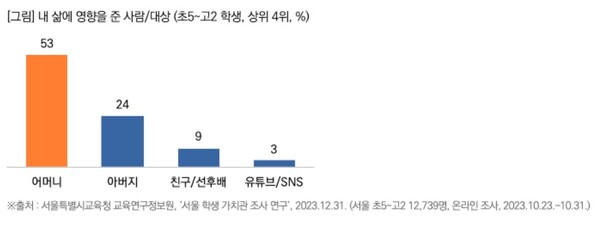 청소년들에게 본인의 삶에 많은 영향을 준 사람이나 대상이 누군지 물었더니 ‘어머니’가 53%로 가장 높았고, 이어 ‘아버지’ 24%, ‘친구/선후배’ 9% 등의 순이었다. 청소년기 부모의 영향력, 그중에서도 어머니의 영향력이 매우 큼을 알 수 있다.