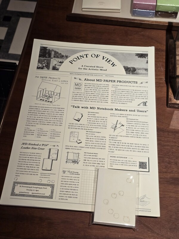 그리고 MD노트가 제작되는 과정을 재현해 전시해놓기도 했다. MD노트 A7 첫 출시를 기념하여 포인트오브뷰의 레더 컬렉션 중 하나인 레더노트 커버와 포인트오브뷰의 상징인 사과가 금빛으로 새겨진 리미티드에디션 MD노트를 선보이기도 했다. 또한 MD 페이퍼에 인쇄한 팝업 신문이 인상적이었다.