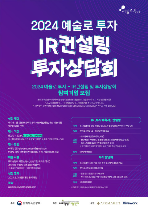 선발된 예술기업에게는 올 6월부터 8월까지 ‘IR 컨설팅’을 통해 △IR 역량 진단 △IR Deck 디자인 및 피칭 등 밀착 컨설팅을 지원해 IR 역량을 고도화한 후 ‘투자상담회’에 참여하는 과정으로 투자유치 가능성을 높일 예정이다.