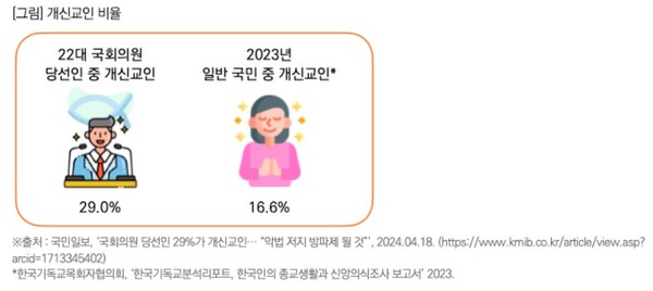 이와 같은 국회의원 당선인의 개신교 비율은 2023년 기준 일반 국민 중 개신교인 비율 16.6%*보다 2배 가까이 높은 수치이다.