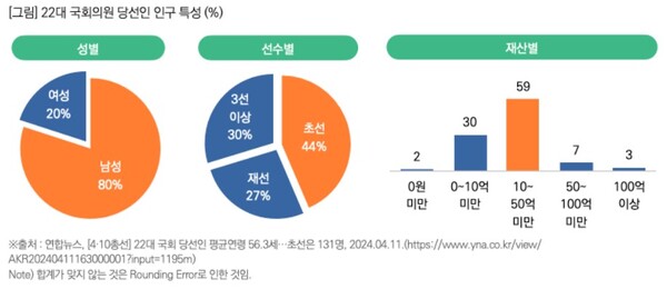22대 국회의원 당선인, 여성 20%, 초선 44%, 재산 10억 이상 68%