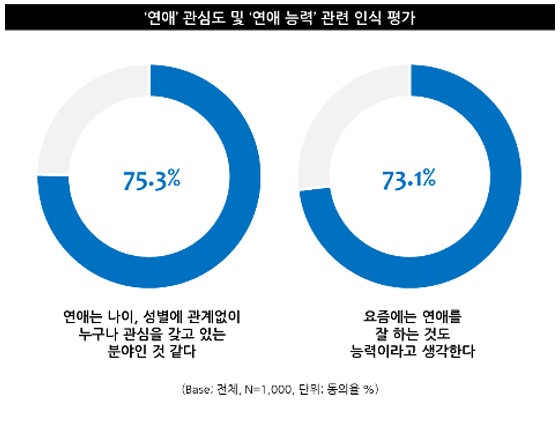 먼저, 전체 응답자 10명 중 8명(75.3%)이 ‘연애’는 나이, 성별과 관계없이 누구나 관심을 갖는 분야라고 응답할 정도로 보편적인 공감대를 형성하고 있는 것으로 나타났다. 아울러 요즘에는 연애를 잘 하는 것도 능력(73.1%, 동의율)이기 때문에 자신의 연애 능력에 문제가 있다면 개선할 의향이 있다(73.1%, 동의율)고 응답할 만큼 능력으로서 ‘연애경험’을 인정받기 위해 적극적인 태도를 보이고 있는 모습을 살펴볼 수 있었다. 연애가 일종의 능력으로 평가되면서 연애 능력 향상을 위한 노력의 중요성도 높게 평가하는 것으로 나타났다.