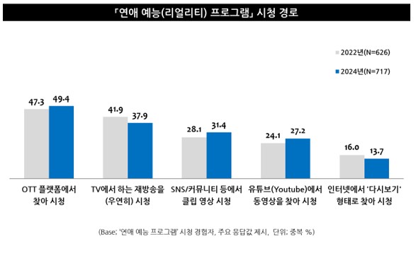 주로 OTT 플랫폼에서 찾아보거나(49.4%, 중복응답), TV에서 하는 재방송을 우연히 시청(37.9%)하는 경우가 많았으며, SNS/커뮤니티 등에서 클립/하이라이트 영상을 시청한다(31.4%)는 응답이 그 뒤를 이었다. 특히, 해당 프로그램 시청 경험자의 28.7%가 연애 예능 프로그램을 시청하기 위해 OTT를 구독했다는 점이 눈에 띄는 결과였다.