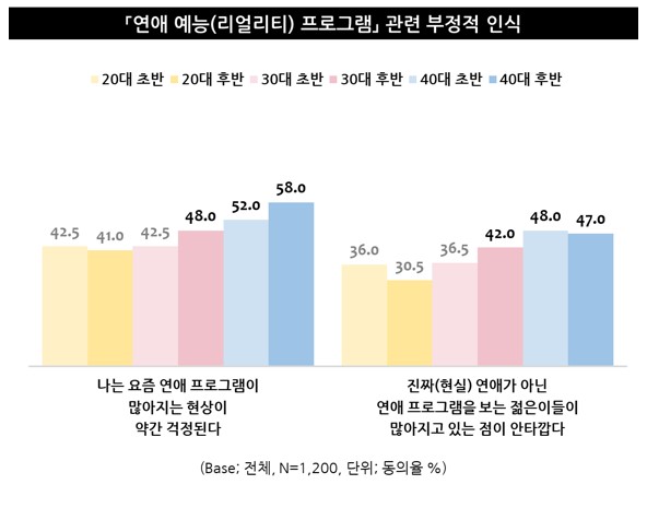 한편, 고연령층을 중심으로 연애 프로그램의 인기 현상에 우려를 내비치는 모습도 확인할 수 있었다. 진짜(현실) 연애가 아닌 연애 프로그램을 보는 젊은이들이 많아지고 있는 점이 안타깝게 느껴지고, 요즘 연애 프로그램이 많아지는 현상이 약간 걱정이 된다는 응답이 높았던 것인데(우측 그래프 참조), 아무래도 최근 젊은 세대의 연애, 결혼 비율이 줄어들고 있는 만큼, 연애 프로그램이 현실 연애를 방해하는 요소가 될 수 있다는 점을 우려하고 있는 것으로 풀이된다.