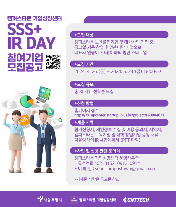 서울특별시와 투자 전문 액셀러레이터 씨엔티테크(주)(대표 전화성)가 운영하는 캠퍼스타운 기업성장센터에서 트리플에스(SSS+) 데모데이에 참여할 우수 스타트업을 선발하기 위한 트리플에스 IR DAY 프로그램에 참여할 기업을 오는 5월 24일(금)까지 모집한다.
