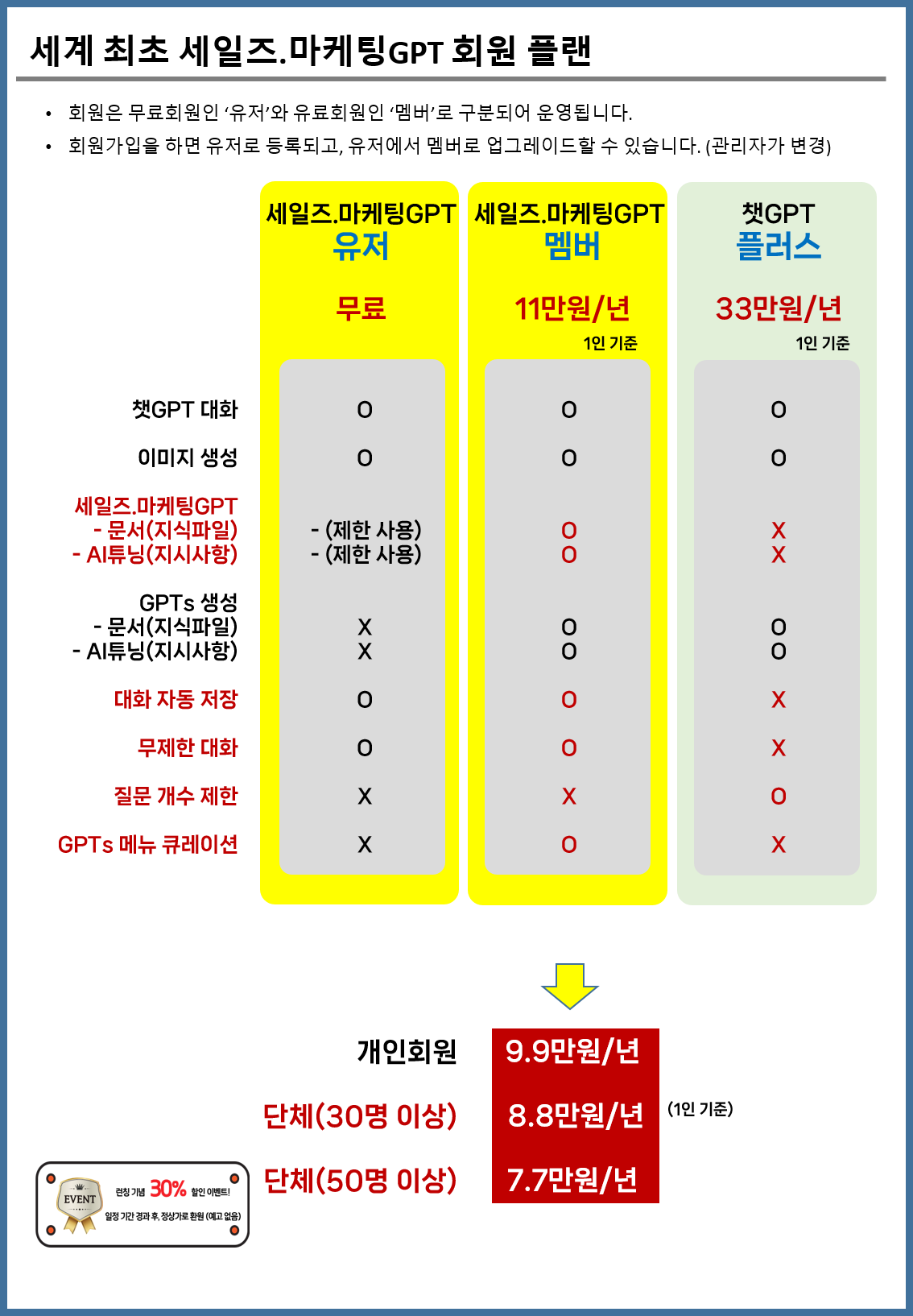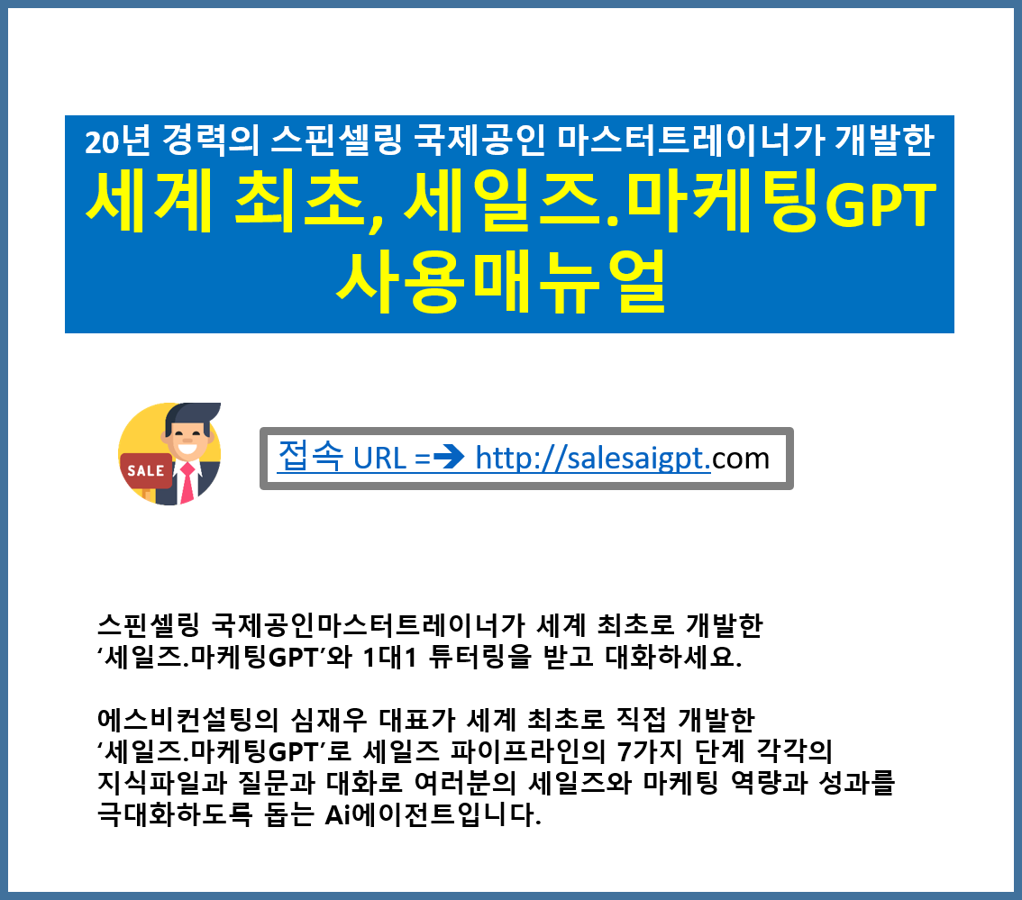여러분의 세일즈와 마케팅 능력을 한 단계 업그레이드하고 싶다면, 지금 세일즈·마케팅GPT를 무료로 경험해 보세요.
