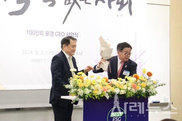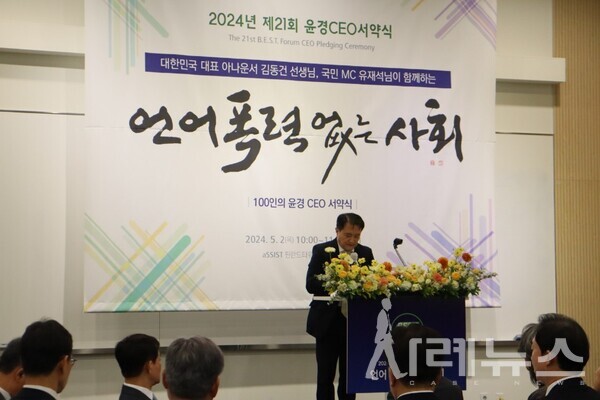 5월 2일 ‘언어폭력 없는 사회’라는 주제로 ‘2024년 제21회 윤경 CEO 서약식’이 핀란드타워 지하 1층 아트홀에서 진행됐다. 올해 진행되는 ‘2024년 제21회 윤경 CEO 서약식’은 21주년을 맞이해 언어폭력 없는 사회를 만들기 위해 CEO의 실천의지가 중요하다는 것을 강조했다.