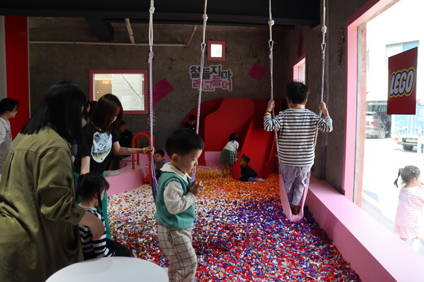 메인 체험 공간인 1층은 ‘브릭 카페’를 테마로 했는데 방문객들은 정신없이 브릭 디저트와 강아지 조립 키트를 골라서 조립하고 있었으며 조립 키트는 자유자재로 만들고 카페에 다시 반납하는 방식이었다. 아이들에게 가장 인기 있는 공간은 그네와 함께 수천개의 레고 브릭으로 가득 채운 브릭 풀과 대형 레고 시티 캠핑카 포토존이었다.