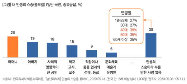 우리 국민에게 ‘인생의 스승이라고 부를 만한 사람이 있는지’를 물은 결과(한국리서치), ‘어머니’가 26%로 가장 높았고, 다음으로 ‘아버지’ 19%, ‘사회적 영향력이 큰 공인’ 18% 등의 순이었다. ‘교사’, ‘교수’보다 ‘부모님’이 더 높게 나타난 점이 눈에 띈다.