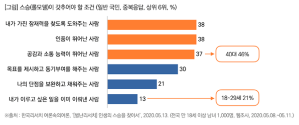 40대의 경우 ‘공감과 소통능력이 뛰어난 사람’을 스승의 조건으로 응답한 비율이 절반 가까이(46%)에 달한 반면, 20대는 ‘내가 이루고 싶은 일을 이미 이뤄낸 사람’을 상대적으로 높게 꼽았다.