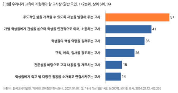 우리나라 교육이 지향해야 할 교사의 모습은 어떠할까? 한국교육개발원(KEDI)이 성인 5천 명을 대상으로 진행한 ‘대국민 교육현안 인식조사’ 결과에 따르면, ‘주도적인 삶을 개척할 수 있도록 재능을 발굴해 주는 교사’가 57%로 가장 높았고 그다음으로 ‘개별 학생들에게 관심을 쏟으며 학생을 인간적으로 이해, 소통하는 교사’(41%)가 꼽혔다.