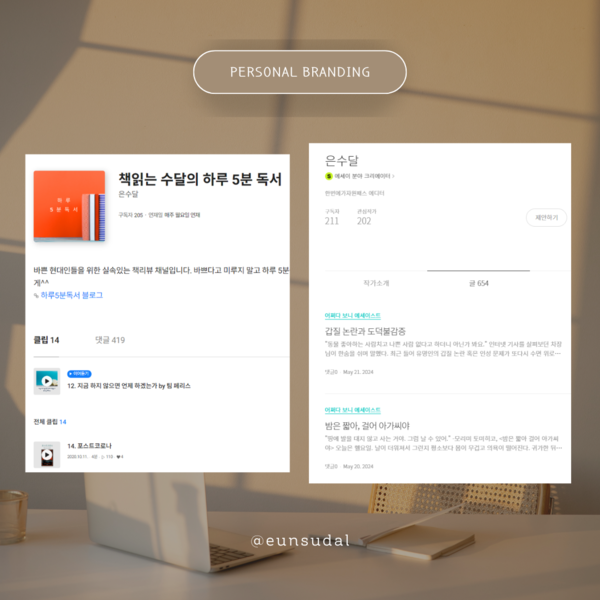 어릴 적부터 독서광이었지만 내가 무엇을 원하는지 찾는 데는 시간이 좀 걸렸다. 그리고 여전히 길을 찾아가는 중이다. 하지만 끊임없이 고민하면서 새로운 걸 경험하는데 주저하지 않는 성향은 크고 작은 성과를 이끌어냈다. 블로그에서 시작해 유튜브 채널, 오디오클립, 그리고 브런치 스토리까지. 한두 가지 분야에 집중하면서 다양한 채널을 통해 나를 알린 덕분이다.