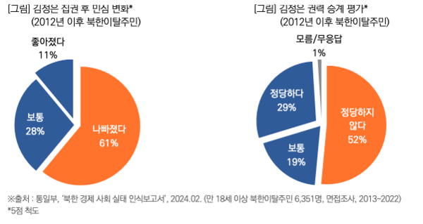 김정은 체제에 대해서 북한 주민들은 어떤 인식을 하고 있을까? ‘김정은 집권 후 민심 변화’를 물은 결과, 북한이탈주민 10명 중 6명이 ‘나빠졌다’고 평가했고, ‘좋아졌다’고 평가한 비율은 11%에 그쳤다.