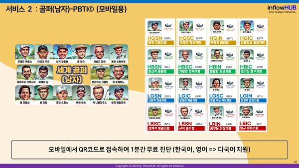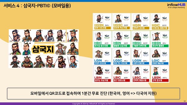 특히 인플로우허브는 고객의 성향과 관심사를 심층적으로 분석할 수 있는 PBTI 테스트들을 제공한다. 펫-PBTI, 골프-PBTI, 삼국지-PBTI 테스트는 사용자가 취미나 선호도에 따라 자신의 유형을 파악하고, 그에 맞는 맞춤형 마케팅 메시지를 수신할 수 있도록 돕는다.