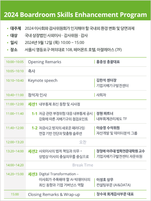 김한석 센터장은 “이번 프로그램을 통해 최근 반복되는 자금횡령 사건으로 인해 부각되고 있는 ‘내부통제’부터, 금융당국과 한국거래소가 추진하는 올해 국내 자본시장의 화두인 ‘기업 밸류업 프로그램’, 비즈니스 창출 가치를 재정의하고 있는 ‘생성형 AI’에 이르기까지, 변화의 흐름 속에서 이사회와 감사위원회의 역할을 심도 있게 논의할 수 있는 뜻 깊은 자리가 되기를 바란다”며 프로그램 기획 취지를 밝혔다.