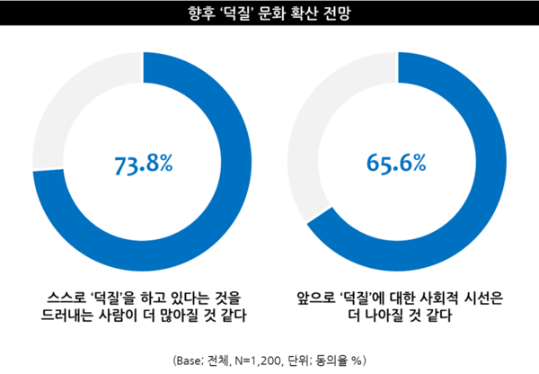이에 따라 전체 응답자의 상당수가 향후 다양한 분야에서 ‘덕질’하는 사람들이 많아질 것 같고(82.8%, 동의율), ‘덕질’에 대한 사회적 시선은 더 나아질 것 같다(65.6%)는 전망을 내비치고 있었다. 스스로 ‘덕질’을 하고 있다는 것을 드러내는 사람이 더 많아질 것 같다(73.8%, 동의율)는 인식도 뚜렷해, 향후 ‘덕후’ 문화가 점차 주류 사회의 일부로 자리 잡을 가능성이 높아 보였다.