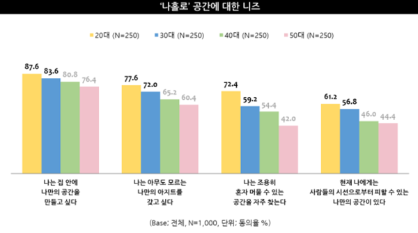 특히, 저연령층을 중심으로 혼자만의 시간을 보내고자 하는 니즈가 두드러지는 특징을 보였는데, 실제로 이들 세대의 경우 조용히 혼자 머물 수 있는 공간을 자주 찾는(20대 72.4%, 30대 59.2%, 40대 54.4%, 50대 42.0%) 경향을 보였고, 사람들의 시선으로부터 피할 수 있는 나만의 공간이 있다(20대 61.2%, 30대 56.8%, 40대 46.0%, 50대 44.4%)는 응답이 상대적으로 높게 평가되고 있는 점이 눈에 띄는 결과였다.