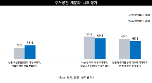 개인 공간(방)이 더 많아지고, 거실이 작은 것을 선호한다(27.5%(2018) → 33.4%(2024))는 응답이 이전 조사 대비 소폭 증가한 반면, 같은 평수라면 방의 개수가 적더라도 큰 방이 있는 집이 좋다(48.8%(2018) → 43.5%(2024))는 응답은 한층 낮아진 모습을 보인 것으로, 넓은 공간보다는 개인의 취향과 라이프스타일에 맞춘 세분화된 공간을 갖고자 하는 모습을 살펴볼 수 있었다.