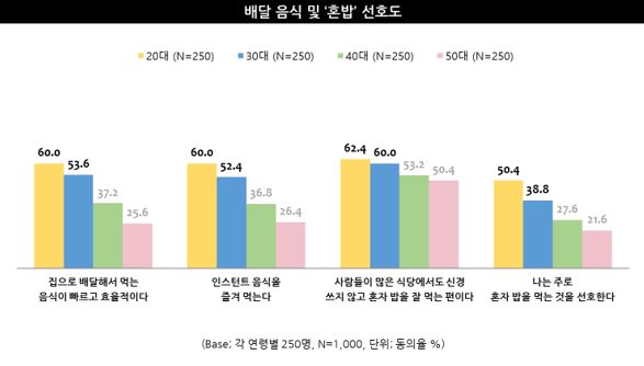 특히, 20대 저연령층의 경우 집에서 혼자 보내는 시간이 타 연령층 대비 높게 평가된 만큼(혼자 있는 시간의 비율 20대 53.1%, 30대 43.5% 40대 39.0%, 50대 42.5%), ‘나홀로’ 성향도 보다 두드러진 특징을 확인할 수 있었다.