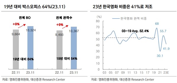 코로나 시국 이후 극장 산업이 불경기라는 사실은 너무나도 많이 다뤄졌기에 이제는 크게 놀랍지 않다. 영화진흥위원회에 따르면 황금기였던 2019년과 비교했을 때 4년이 지난 2023년에도 영화시장의 매출은 2019년의 65%에 불과했다.