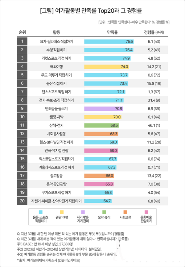 여가활동 경험자의 만족도 1위 활동은 △요가·필라테스(76.6%)였고, △수영(76.4%) △라켓스포츠(74.9%)가 미세한 차이로 뒤를 이었다.
