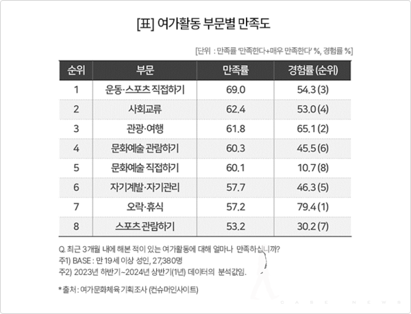 경험률 1위 ‘오락∙휴식’과 ‘스포츠관람’ 만족도는 최하위