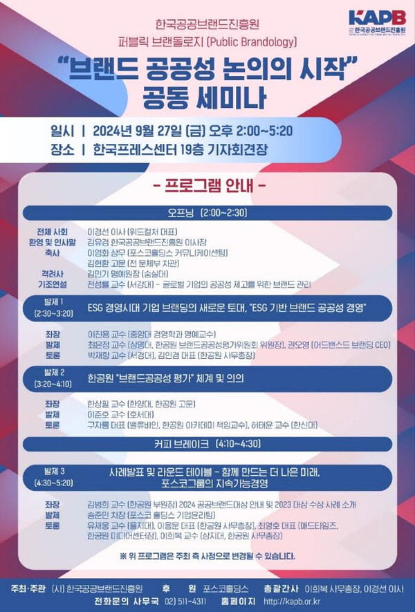 (사)한국공공브랜드진흥원(원장 김유경)이 9월 27일(금) 오후 2시 한국프레스센터 19층 기자회견장에서 포스코홀딩스와 함께 공공 및 기업 브랜드의 공적 가치 제고를 위한 공동 세미나를 개최한다.