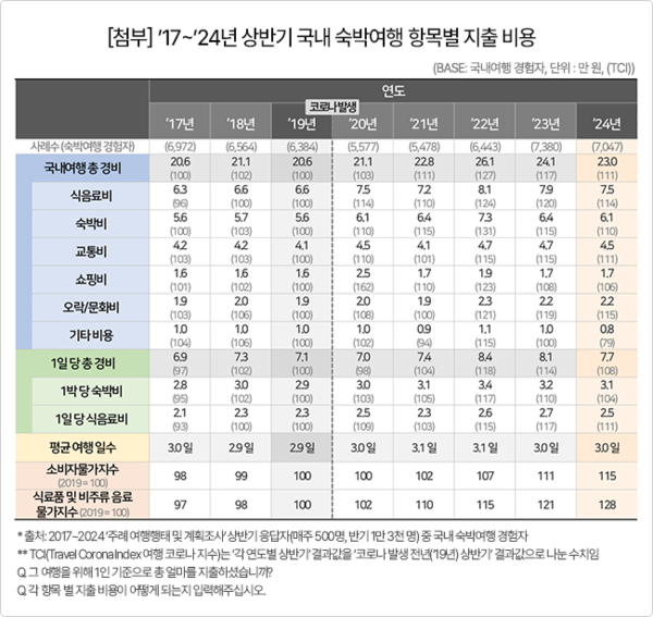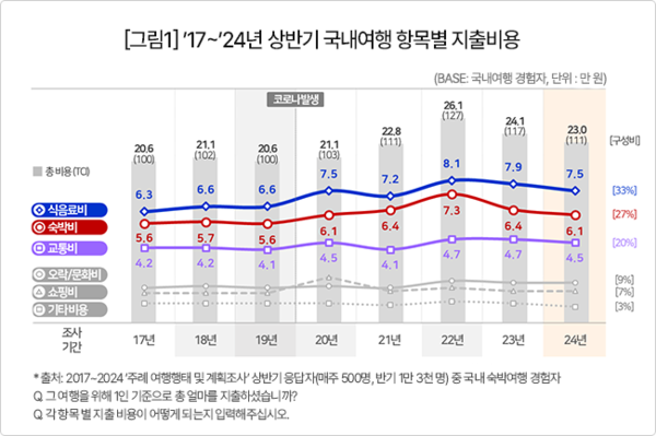 여행 리서치 전문기관 컨슈머인사이트가 2015년부터 수행하는 ‘주례 여행 행태 및 계획 조사’(매주 500명, 연간 2만6000명)에서 ’17년 이후 연도별(상반기 기준)로 국내여행자가 지출한 총경비와 항목별 지출금액 추이를 비교했다. 명목상의 지출금액과 함께 그동안의 물가상승률을 고려한 실 지출금액의 추이도 비교했다.