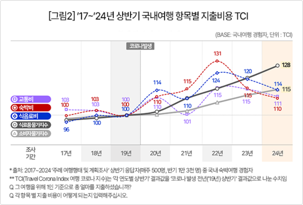 물가 상승을 고려하면 식음료비의 지출은 역대 최저 수준이다. 식음료비의 ’24년 TCI는 114로 교통비(111)나 숙박비(110)보다 높다. 그러나 통계청 소비자물가지수를 토대로 환산한 ‘종합소비자물가지수’의 TCI가 115, ‘식료품 및 비주류음료 물가지수’(이하 식료품물가지수)의 TCI가 128인 것을 고려하면 식음료비의 지출은 사실상 감소했다.