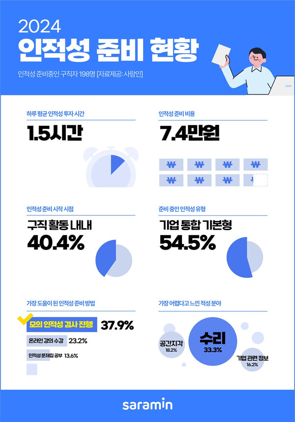 채용 과정에서 적합한 지원자 선별을 위한 인적성 검사가 필수로 자리매김하면서 합격을 위해 인적성을 준비하는 구직자들이 많다. 이에 커리어 플랫폼 사람인(대표 황현순)이 현재 인적성 검사를 준비중인 구직자 198명을 대상으로 ‘2024 인적성 준비 현황’에 대해 조사한 결과를 정리했다.