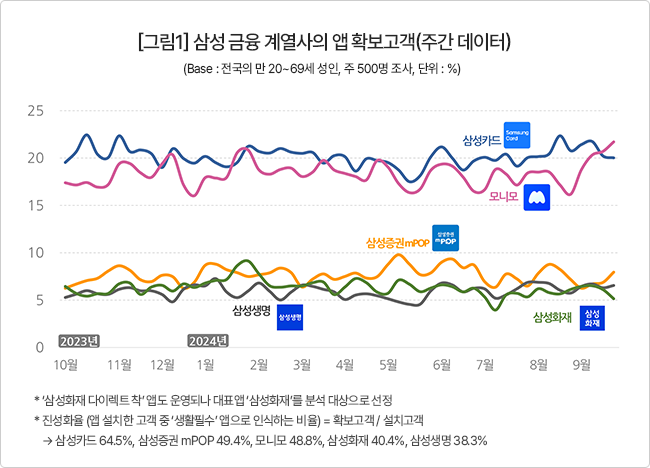 삼성카드와 모니모가 20% 안팎에서 선두그룹 형성. 삼성증권 mPOP, 삼성생명, 삼성화재는 5~8%대를 오르내리고 있음.