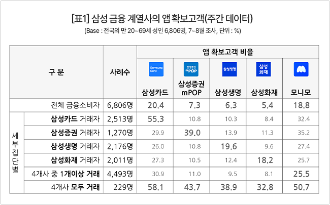 모니모는 ‘삼성 금융 4사 가운데 한 곳이라도 거래하는 고객’ 4명 중 1명이 ‘생활 필수 앱’으로 이용 중임. 특히, 삼성카드, 삼성증권 거래고객에게 더욱 인기가 있는 것으로 보임.