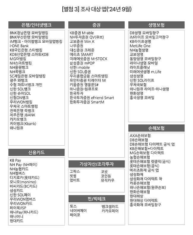 ** 비고(해당권역) : [별첨3] ‘조사 대상 앱’을 퍼블리셔의 사업영역을 기준으로 분류(e.g. 은행/인터넷뱅크, 증권, 신용카드 등)