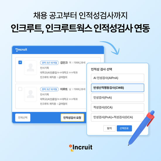 문상헌 인크루트 CBO(최고 브랜드 경영자)는 “이번 연동을 통해 인크루트에서 채용을 진행하는 기업회원들은 공고 등록부터 지원자의 인적성검사까지 한 번에 할 수 있게 됐다”며 “앞으로도 다양한 인크루트의 서비스를 통해 기업회원이 가장 만족할 수 있는 채용 프로세스를 만들어 나갈 것”이라 말했다.