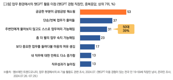 챗GPT를 업무에 활용하는 것에 대한 이점으로 직장인들은 ‘궁금한 부분이 빠르게 해소됨(53%)’을 가장 높게 꼽았고, 다음으로 ‘단순/반복 업무 감소함(37%)’, ‘주변인에게 묻지 않고도 업무처리 가능해짐(31%)’ 등의 순으로 응답했다. ‘주변인 도움 없이 업무처리 가능함’ 비율은 저연령층 대비 50대 연령층에서 상대적으로 높게 평가된 점이 특징적이다.
