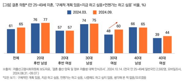 만 25~49세 미혼 국민에게 결혼 의향을 물어본 결과 3명 중 2명(65%) 정도가 ‘있다’고 응답했는데, 이는 6개월 전 조사보다 4%p 증가했다. 전반적으로 남성의 결혼 의향률이 여성보다 높게 나타났는데, 30대 여성의 결혼 의향률이 6개월 전 조사보다 크게 증가(48%→60%)한 점이 주목된다.